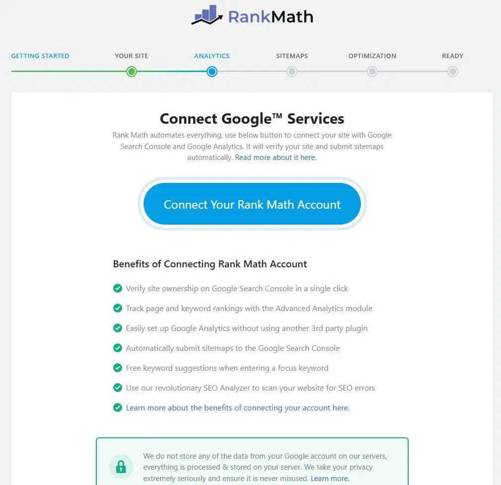 Now you need to connect your Google account with RankMath so you can easily see your analytics data on the RankMath dashboard. Also, you can skip this step if you don’t want to connect with a Google account.