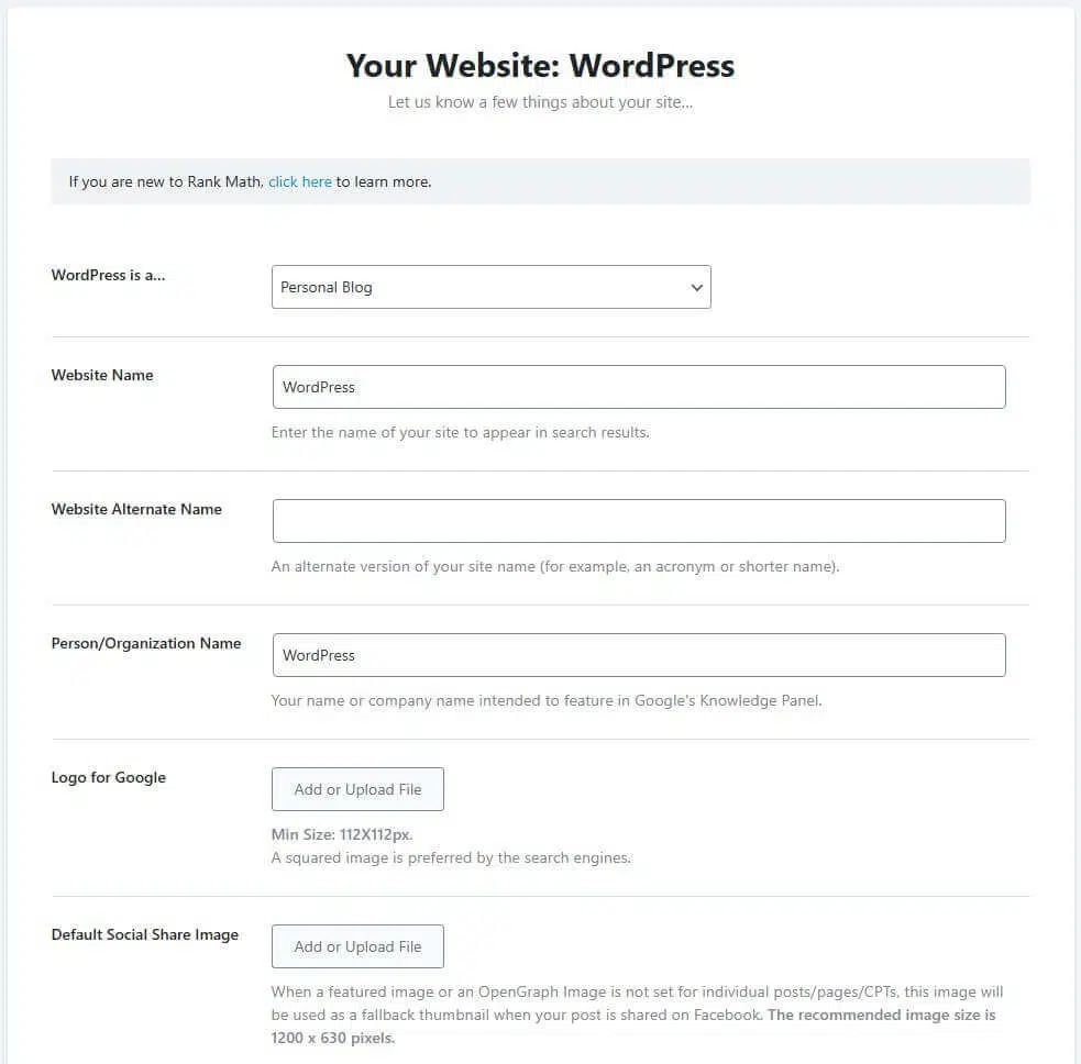 Then add some personalised info about my website, like my WordPress site is a Blog/eCommerce/agency/blog, website name, website alternative name, Logo for Google, and social share images.