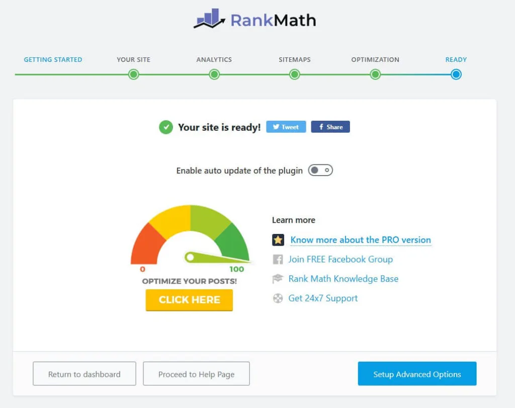 Now that you’re ready to go with the RankMath plugin, click on the Return to Dashboard to Land your WordPress Dashboard. RankMath’s Advanced SEO features can help you to get the Best SEO score on your website so you can rank higher in search engines.