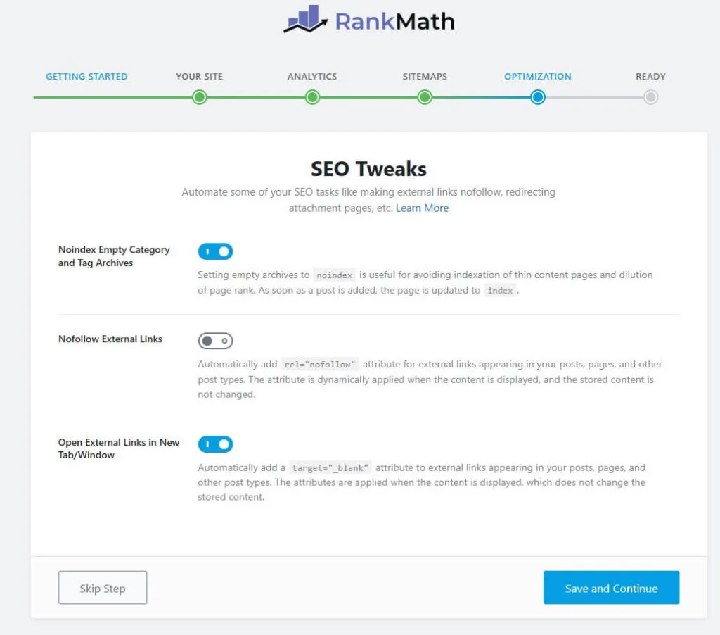 After completing all of those previous settings, you’ll come to the Optimization table. On this tab, you need to enable some of the useful settings like Noindex Empty category, Nofollow External links, and open External Link in a new tab.