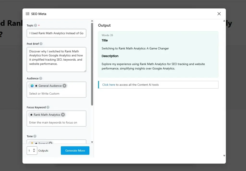 As shown in the screenshot, Content AI helps me generate an SEO-optimized title and meta description based on the focus keyword. This makes the content more relevant and improves its chances of ranking higher on Google.