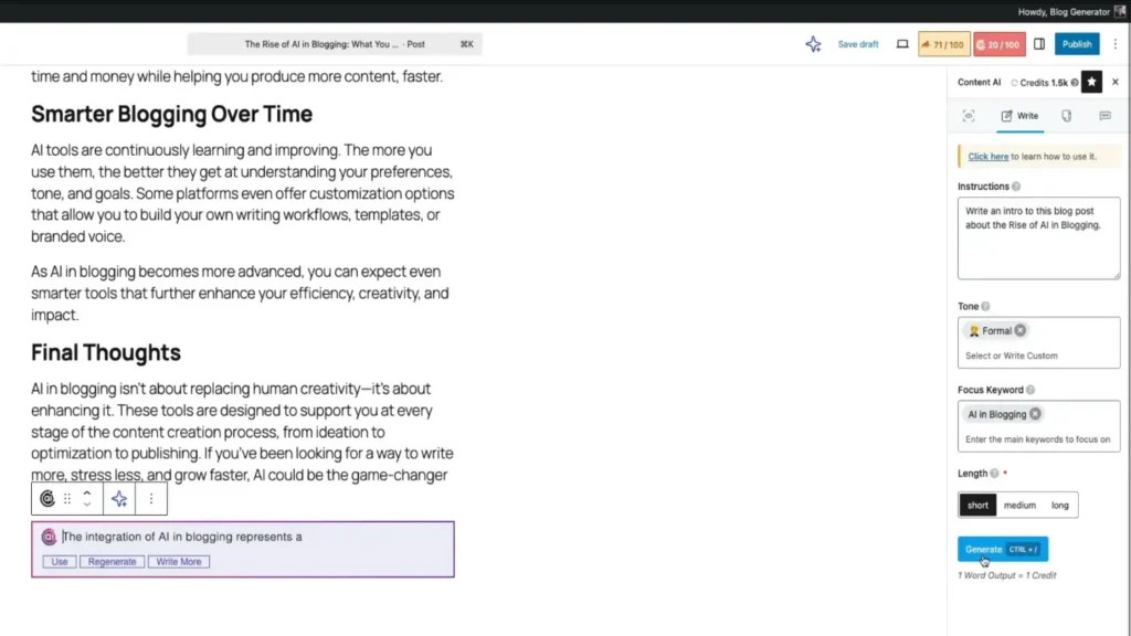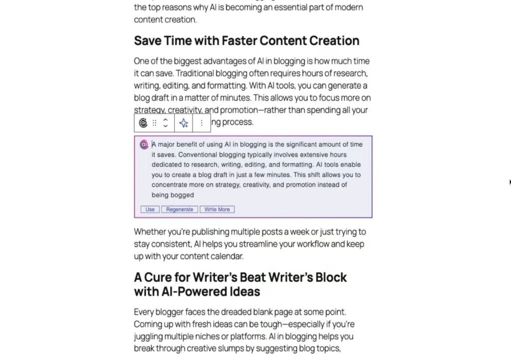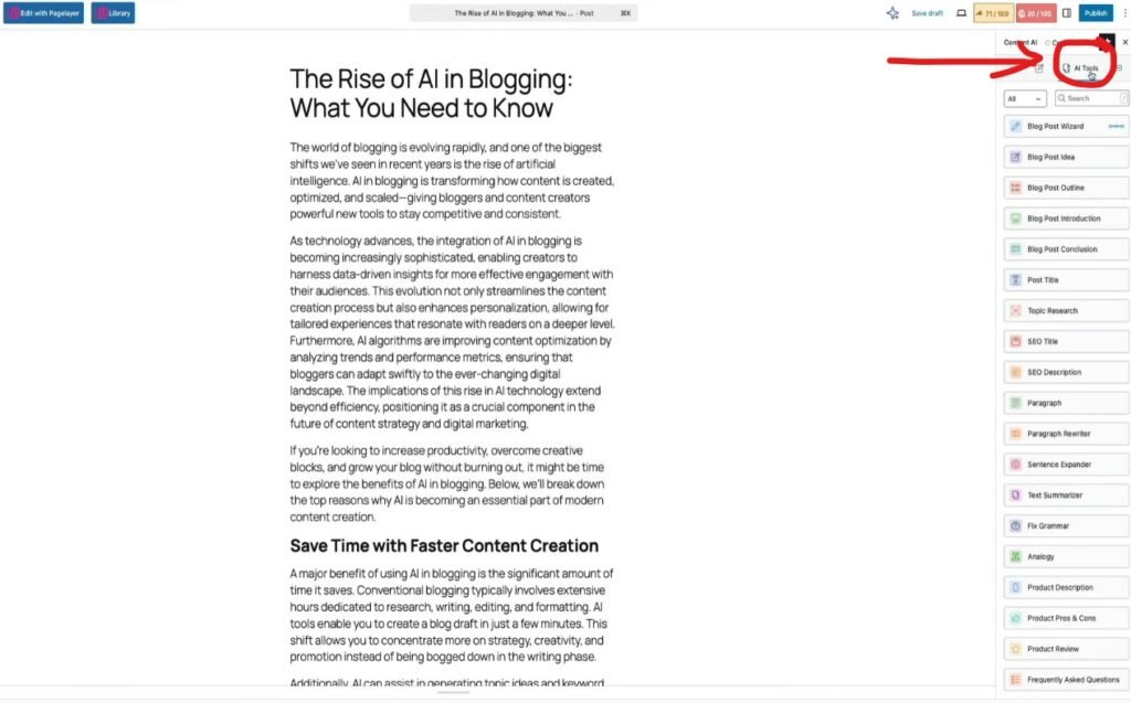 The AI Tools tab gives you access to all content creation features in one place. You can quickly generate blog ideas, outlines, introductions, and full paragraphs while writing inside the editor.