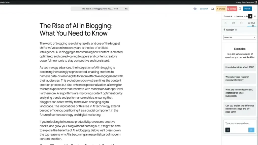 The Content AI Chat (RankBot) works like an AI assistant inside your editor. You can ask questions, get content ideas, or generate text without leaving your writing screen.
