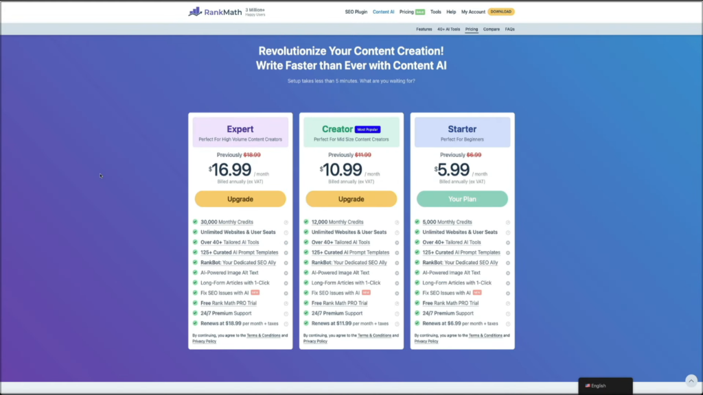 Rank Math Content AI offers three plans—Starter, Creator, and Expert—based on your content needs. The Starter plan is ideal for beginners, providing around 5,000 monthly credits along with access to core AI tools for writing and SEO optimization.