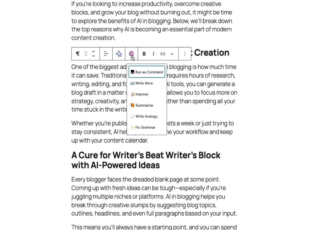 When you click the AI icon, a small menu appears with options like Write More, Improve, Summarize, Write Analogy, and Fix Grammar. These tools help you expand content, make it clearer, shorten it, or fix errors instantly, making the writing process faster and more efficient.