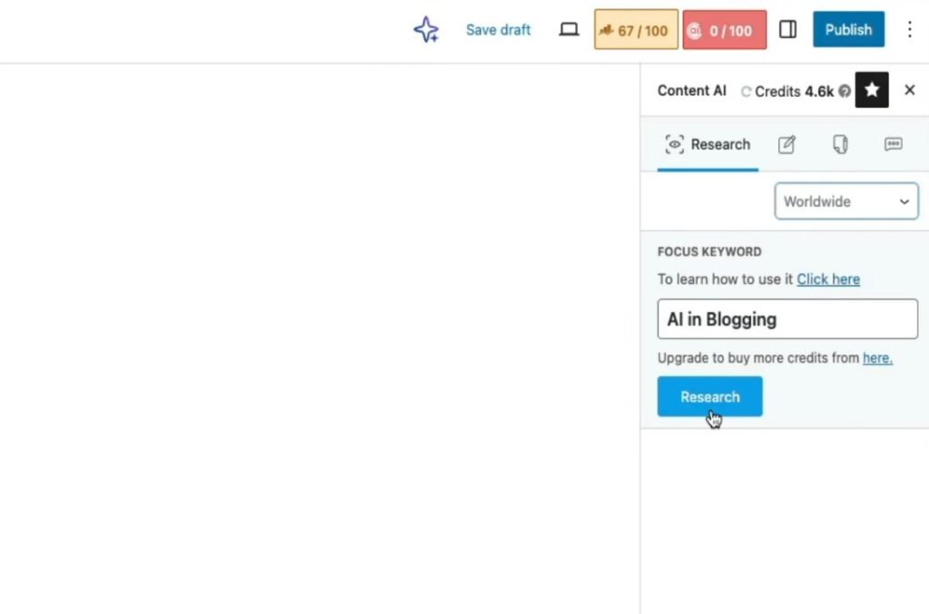 Then click on the research button to research the keyword with Rank Math Content AI features.Â