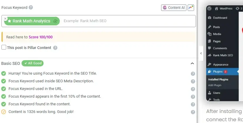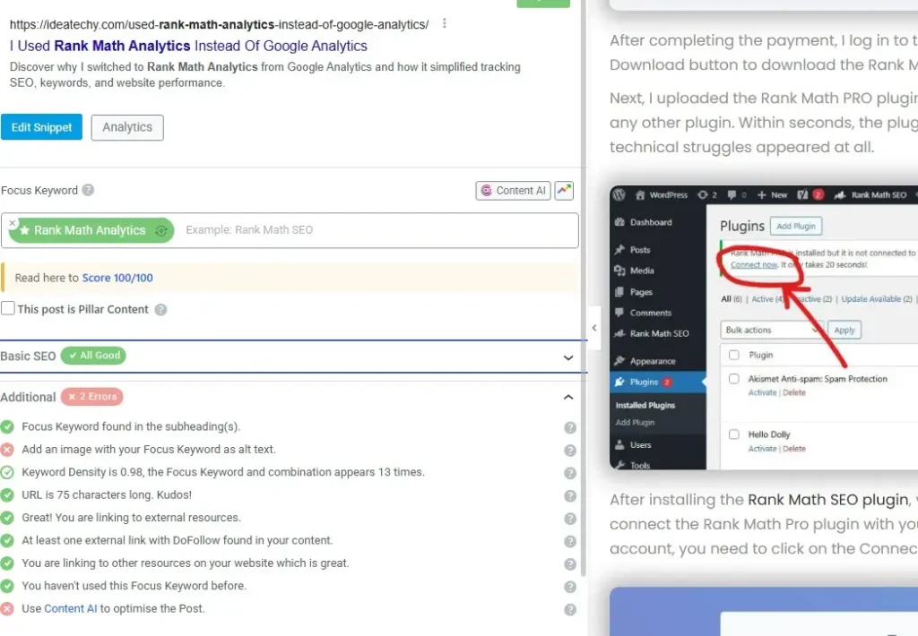 When I started using Rank Math, the focus keyword feature helped me stay clear on my target keyword. It shows whether I’m using the keyword in the title, URL, and content properly.