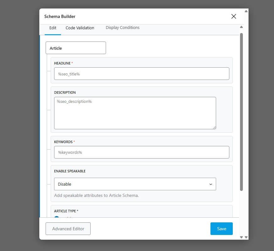 Creating an article schema in Rank Math is very simple. I just select the Article schema and open the schema builder.