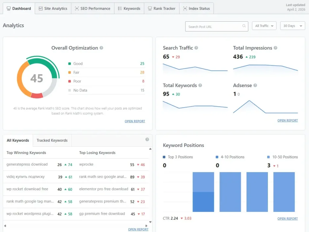 Rank Math Advanced Analytics brings all important SEO data into one place. I no longer need to switch between different tools to track performance.