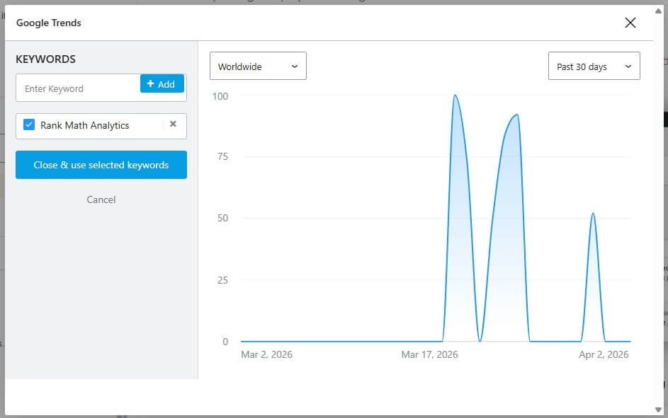 When I started using Rank Math’s Google Trends feature, it helped me understand keyword demand better. I can see how a keyword is performing over time without leaving WordPress.