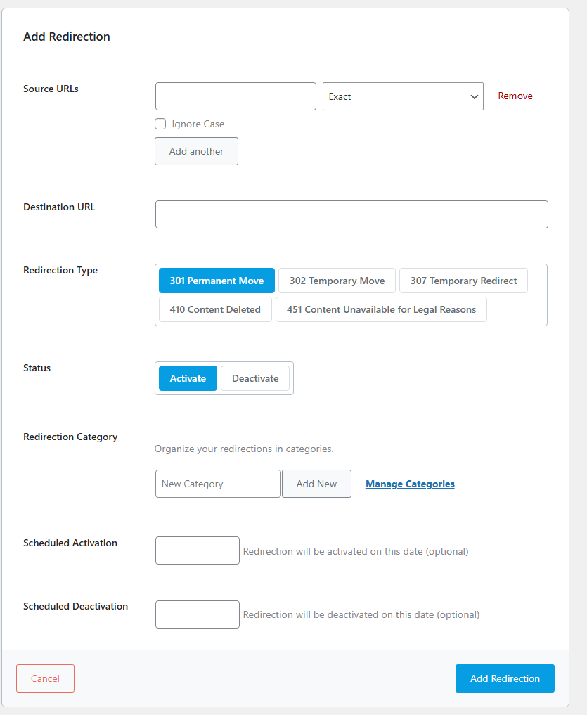 Make sure the status is set to Activate so the redirect starts working immediately.
